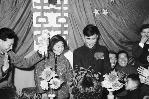 1957年春節(jié),遼寧沈陽風(fēng)動工具廠的工人鞠復(fù)海(新郎)和俞鳳仙(新娘)在婚禮儀式上接受朋友們的祝賀。