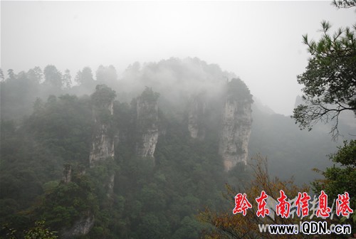 過了屏扇崖景點(diǎn),攀上老虎背景區(qū),這一帶,游覽小路沿山脊修筑,兩邊是深達(dá)數(shù)百米的深谷,十分險峻,但林木蔥郁,景色非常美麗。此時,雨越下越大,眼前山霧繚繞,一片朦朧。在一處山洞停下來歇息的時候,我們才發(fā)現(xiàn)渾身濕透了。