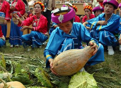 節日那天,火塘邊的方桌上擺著滿盛糯米飯的長凳,飯上蓋四張云南葉(接骨丹),桌邊置一長凳,凳上按一定距離給各房擺若干張云南葉。葉上放一堆糯米飯。并加三節未出穗的禾苞和四尾魚,兩碗煮爛的瓜菜和兩碗甜灑,以及干蕨菜拌和糯米、高粱制成的腌菜。旁邊放上一雙實心竹制的新筷子。擺放完畢,開始祭供祖先,先由年齡最大者燒香化紙祈禱祖先英靈。品嘗各種飯菜,接著,按各房長次的順序入席吃祭供的新食,共同祭祖宗。