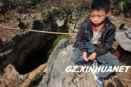 貴州黔西南布依族苗族自治州敬南鎮巴布村,一名兒童守在快要干枯的水池邊(2010年2月23日攝)。新華社記者 劉續 攝