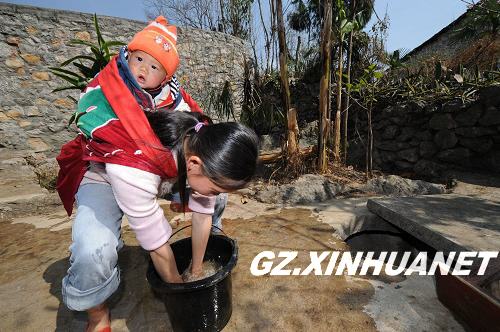 2010年2月24日,黔西南布依族苗族自治州敬南鎮(zhèn)巴布村村民在水窖邊取水洗衣。