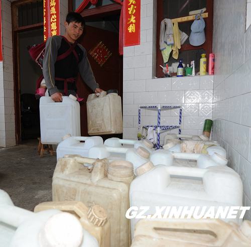 2010年2月24日,黔西南布依族苗族自治州敬南鎮(zhèn)巴布村村民戴大銀在搬運從20公里外運來的水桶。新華社記者 劉續(xù) 攝