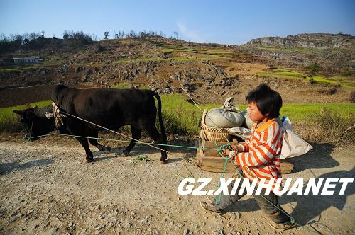 2010年2月24日,在黔西南布依族苗族自治州興仁縣豐巖村,一個孩子趕著牛車拉水回家。新華社記者 劉續(xù) 攝