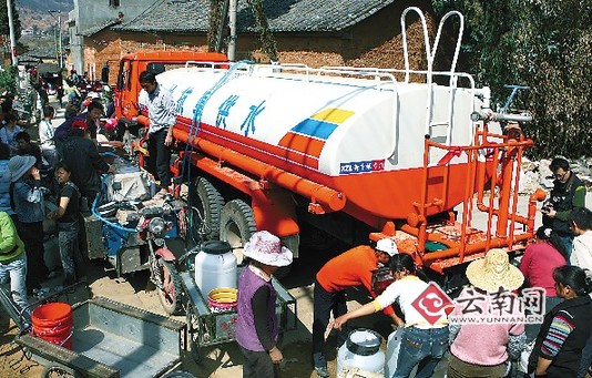 下午2時(shí)15分,記者又來到該縣鹿阜鎮(zhèn)山?jīng)_村委會(huì)唐家村,一輛印有“石林抗旱供水”字樣的桔紅色送水車開進(jìn)了村,家家戶戶把大大小小、形形色色的水桶、塑料盆排成隊(duì)等待接水,拖拉機(jī)、三輪車、摩托來往穿梭運(yùn)水,大家挑的挑、抬的抬,一幅熱火朝天的供水場面。7歲的小朋友符艷麗高興地說,“終于有干凈的水喝啦,山上的水都挑干了,我一個(gè)多月沒洗澡了。”看著此情此景,大可鄉(xiāng)副鄉(xiāng)長曾躍祥欣慰地說,“群眾看到黨和政府及社會(huì)各界幫助大家抗災(zāi)救災(zāi),深受感動(dòng)。我們一定能戰(zhàn)勝災(zāi)害渡過難關(guān)。”