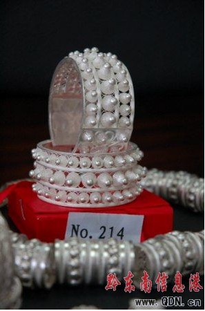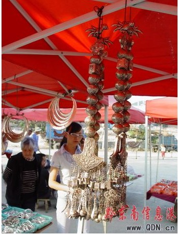 若論及飾銀之盛,在中國廠裹大地上,恐怕沒有比苗族更甚者。尤其在苗族三大方言區(qū)之一的黔東方言區(qū)內(nèi)的清水江流域、都柳江流域和懈陽河流域,那里的苗族簡直就是一個被焰摺銀光包裹著的民族。清水江畔的蘆筏場上,苗族姑娘們渾身上下的銀飾,重逾二十斤。地處偏僻且 遠離白銀產(chǎn)地,經(jīng)濟文化發(fā)展又相對較為落后的苗族,把價值不菲的銀飾作為民族的群體選擇,并成為中國各民族中的飾銀百戶,無疑是現(xiàn)實展示在我們面前的一個奇恃的文化現(xiàn)象。探其原委,這同苗族的物質(zhì)及精神文明發(fā)展密切相關。 聯(lián)系該民族的歷史和現(xiàn)實并加以審視和研究,我們不難發(fā)現(xiàn),這種關聯(lián)竟涉及到圖騰祟拜、宗教巫術、歷史遷徒、民俗生活等諸多方面,足以令人透過表面,觀察到苗族文化本質(zhì)的東西。 "服飾是文明的窗口,衣裳是思想的形象。服飾又是民族精神的外化,社會制度的表征"。苗族銀飾不僅向我們展示了一個藝術的物質(zhì)世界,而且展示了一個集合著各種觀念的精神世界。從某種意義上說,它的歷史是一部感性化了的文化發(fā)展史。