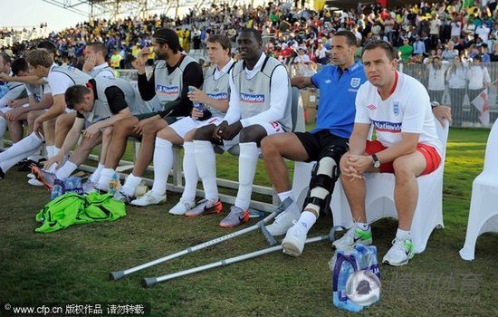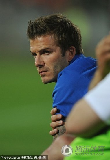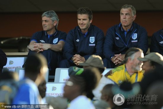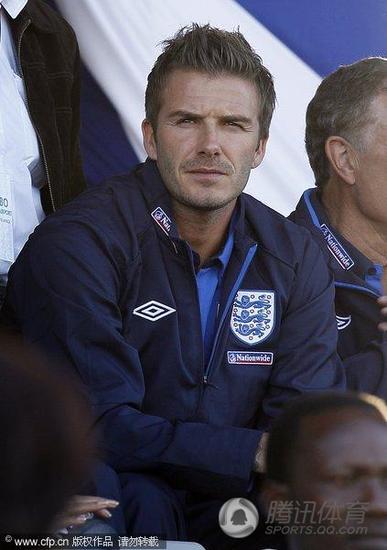 2010年6月7日,南非,2010世界杯熱身賽,英格蘭3-0鉑星(一只南非當(dāng)?shù)厍蜿?duì)),費(fèi)迪南德拄拐助威,場邊觀賽的小貝依舊帥氣逼人。
