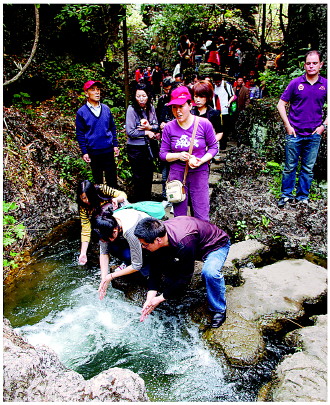 游玩天星橋,游客們在珍珠泉興致勃勃地觸摸黃果樹大瀑布流淌的清水。古尚臺 攝