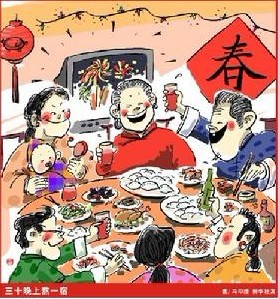 算準了“年”肆虐的日期,百姓們便把這可怕的一夜視為關(guān)口來煞,稱作“年關(guān)”,并且想出了一整套過年關(guān)的辦法:每到這一天晚上,每家每戶都提前做好晚飯,熄火凈灶,再把雞圈牛欄全部拴牢,把宅院的前后門都封住,躲在屋里吃“年夜飯”,由于這頓晚餐具有兇吉未卜的意味,所以置辦得很豐盛,除了要全家老小圍在一起用餐表示和睦團圓外,還須在吃飯前先供祭祖先,祈求祖先的神靈保佑,平安地度過這一夜,吃過晚飯后,誰都不敢睡覺,擠坐在一起閑聊壯膽。就逐漸形成了除夕熬年守歲的習慣。