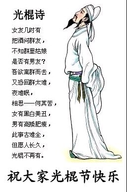 關于光棍節的起源,筆者無從考證,但是流傳的比較廣泛的說法是:光棍節起源于大學校園,由于大學寢室多為四人一間,而且在一間寢室中常常住著四個光棍,這“11.11”的日子正好形象的代表了四個光棍,于是乎光棍節就此誕生了。