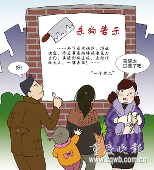 近日,重慶一位老人將一則“殺狗告示”張貼在了南岸區(qū)美堤雅城的公告欄上,告示內(nèi)容大致如下:“養(yǎng)狗的居民:本人住在小區(qū)內(nèi),已被散放的狗咬過多次。本人患有糖尿病、高血壓等多種疾病,受不得驚嚇!為了自我保護(hù),特此決定,今后帶著棍棒或者菜刀出門,再遇到狗追咬,無論大小,一律殺死!”(12月27日《重慶晚報》)