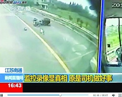 但在“肇事者”、南通汽運集團飛鶴快客公司司機殷紅彬那里,記者卻聽到了截然相反的說法,當(dāng)天中午12點半,殷紅彬開車載著乘客從石莊出發(fā)前往南通市區(qū)。12點34分,他駕駛的大巴車開上了離始發(fā)站不遠的張黃立交橋。下橋時發(fā)現(xiàn)前方有輛三輪車橫在路面上,靠近后看清楚是一名老人被壓在車下,于是他靠邊停車,自己和乘務(wù)員郁維貞立即跑下去,將石老太攙扶起來。“當(dāng)時我將老太太扶起來后,問她‘傷得怎么樣’,她還說‘不要緊’。”殷紅彬說。因為要趕時間,殷紅彬?qū)⒗咸唤o了正好路過此地的一位和老太相識的村民,但以為大巴車是肇事車的村民卻將殷紅彬攔住“不讓走”,懷疑是他撞了人。最后,在讓對方記下自己車牌號后,殷紅彬才重新開車上路。“一路上心里都很壓抑,為什么做好事還被冤枉,得不到理解?”殷紅彬?qū)τ浾哒f。