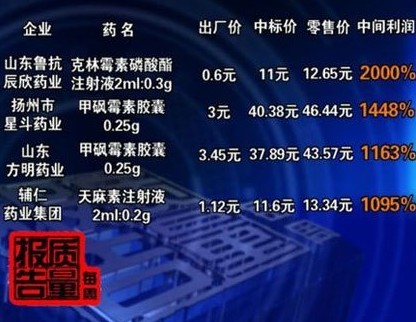 隨后記者又對上海、天津、黑龍江等地的山東魯抗辰欣藥業(yè)生產(chǎn)的同一規(guī)格的克林霉素磷酸酯注射液的中標(biāo)價(jià)進(jìn)行了調(diào)查,發(fā)現(xiàn)上海中標(biāo)價(jià)為12.8元、天津中標(biāo)價(jià)為11.13元、黑龍江中標(biāo)價(jià)為11.5元,醫(yī)院的零售價(jià)也都超過12元,從出廠價(jià)到醫(yī)院零售價(jià),中間利潤也都高達(dá)2000%以上。