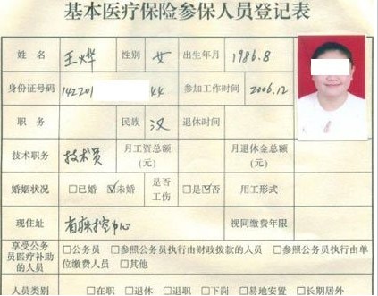 一份山西省疾病預防控制中心內部的《基本醫療保險參保人員登記表》顯示:王燁,女,1986年8月出生,參加工作時間2006年12月。