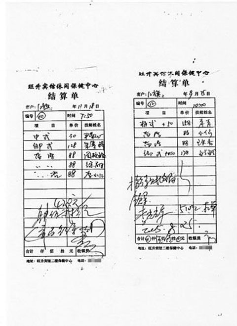 網上出現的結算單說的是旺升賓館休閑保健中心。旺升賓館地處祁東縣城繁華地帶。23日上午,記者以旺升賓館房客身份來到二樓保健中心服務臺,與服務臺里一個中年女子閑聊起網上的休閑保健中心結算單!澳銈兂雒四,網上到處是!庇浾哒f。中年女子“咯咯”大笑,說:“現在看不到了吧?刪了呀!碑斢浾哒f還可以看到時,中年女子又笑,“你們也是從網上看到我們賓館的名字才來的吧”,然后問記者在哪里還可以看到帖子。
