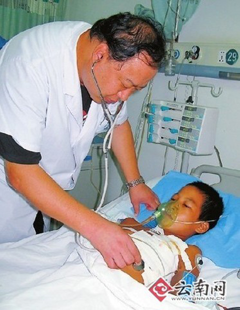 中國經濟網消息 八一建軍節這天,一個12歲哈尼族男孩玩耍時,竟被竹竿刺穿胸部并插入其右心室長達5小時,就在男孩生命垂危之際,一場軍地醫院接力搶救賽展開了。最終,開遠解放軍59中心醫院的醫生,花4小時修復了男孩差點就停跳的心臟。昨天早上,儂百明神志已完全清醒了,睜著眼睛看著周圍陌生的一切。哈尼族護士李肖玲則在和陪護儂百明的儂香干等人用哈尼語交談著。儂百明姑姑說:“早上他已經吃飯了!”