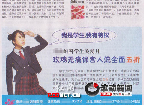 “學生是我們的未來,發生意外誰來關護?”一張疑似報紙上刊登的廣告文字如此開頭,稱該醫院推出了學生關愛月,凡是來醫院進行人流手術的學生患者,憑借學生證就可以享受全程五折優惠,“手術類型為國際最先進的玫瑰無痛保宮人流手術”,并聲稱這種手術“時間短,術后即可自由活動,不影響學習工作”。