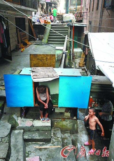 住在箱中的老人頭戴帽子,裸著上身,蜷縮在箱子里,箱底鋪著一塊綠色的塑料布,就成了老翁的床。箱子內沒有透氣的窗戶,僅有兩頁可以推拉的門,為了防潮,箱子下面留了約30厘米的空隙。