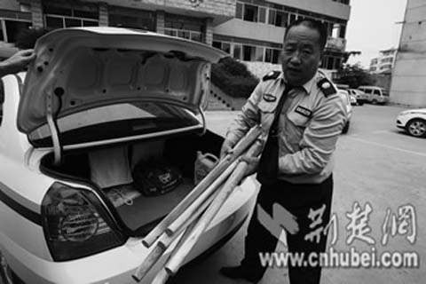 嘉魚警方介紹,當幾名帶頭人員被帶離現場后,堵在公安局門前的4輛靈車先后逃離。逃跑過程中,群眾看到從4臺靈車上,丟棄下來十多根手臂粗、長約1米的木棒。截至目前,該縣治安大隊民警已找到現場遺棄的8根木棒。