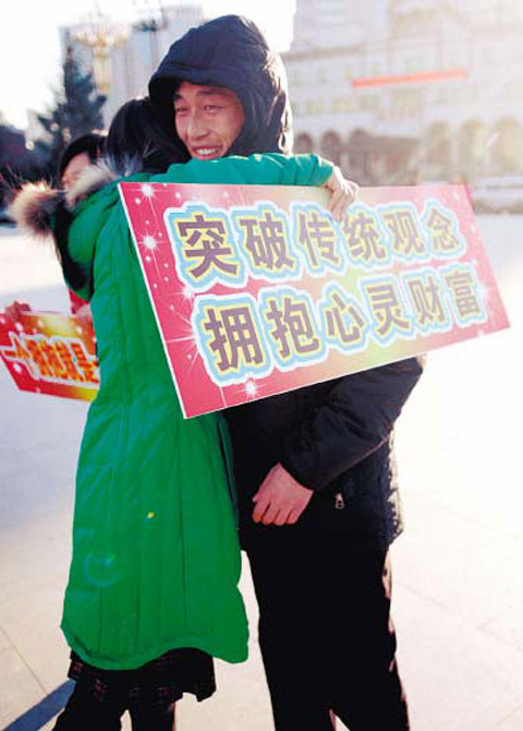《沈陽晚報》消息 “我能擁抱您一下嗎?”當你在街頭碰到一個靚妹或是一位帥哥張開雙臂這樣問你時,你會拒絕這份熱情嗎?11月2日,17名青年男女手舉著寫有“敞開心靈、真誠擁抱”的小展牌,行走在沈陽市中山路步行街時,與來往行人相互擁抱,他們的舉動引起了不少市民的關注。
