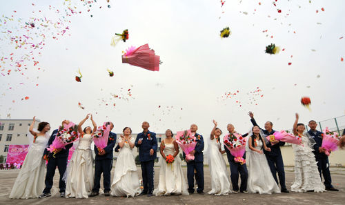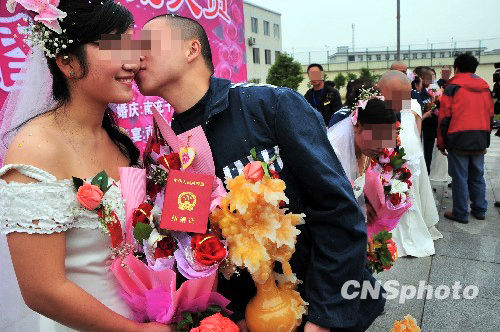 人民圖片網消息 2009年11月6日上午,四川南充嘉陵監獄操場上張燈結彩,一場特殊而莊重的集體婚禮在這里隆重舉行。7名參加集體婚禮的服刑人員接過結婚證時,高興得喜極而泣。
