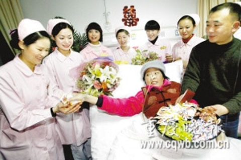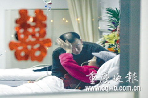 女子叫蔣翠,今年38歲。男人叫張兵,今年44歲。張兵推著妻子,輪椅軋過紅地毯,迎著空中的花瓣,進入病房。“祝福你們,你們讓我們懂得了攜手到老的承諾。”醫生護士共同祝賀夫妻倆,希望他們“新婚”快樂。看著布置成新房的病房,蔣翠哭出了聲音。“希望你們能堅持下去,恩愛永遠。”武警總隊醫院醫務處主任向貴平擔當起了主婚人的職務,向夫妻頒發了結婚證。這張結婚證也傾注了醫院醫生護士的心血。通過和南岸區民政局聯系、溝通,婚姻登記處工作人員特地到病房,為蔣翠辦理了結婚證。