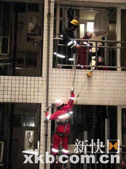 警察和消防員接報后迅速趕到現場,警察敲門發現女子所在房間的大門反鎖,無論怎么勸說里面的人都不開門。“警察本想破門進去,但又怕會刺激到她的情緒。”目擊街坊說,消防員后來選擇20樓一單元陽臺作為營救點,在戰友的幫助下,一名消防員身上系著繩索,另一頭固定在圍欄鐵柱上,然后緩慢向下攀吊。