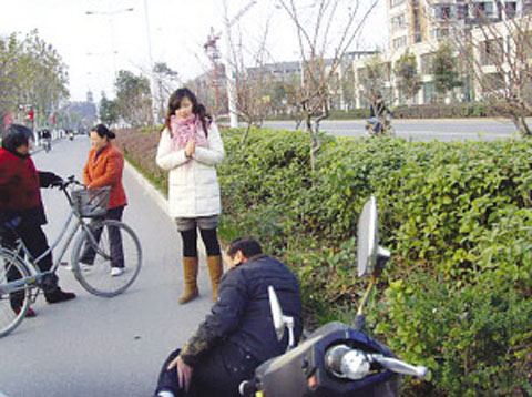 揚子晚報消息 幾天前,一騎電動車的男子突然栽倒在鎮江市中山北路的路邊綠化帶中,當時沒有人伸援手。一名身穿白色羽絨服的年輕女孩經過,立即撥打120和110,并一直守候在其身旁,一直等到救護車將傷者救走。女孩的看護報警救人,被網友“西門三炮子”拍下并上傳到鎮江熱門論壇上,女孩翹首等待救護車的眼光感動了太多的網友。4萬余名鎮江網友瀏覽后感動、贊嘆不已,“善良的女孩最美麗,”他們紛紛追問這名“好姑娘”的真實身份。