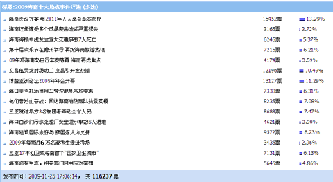 回首即將過去的2009年,海南有太多令人感動的事件,有太多令人關注的新聞熱點,他們伴隨著海南人民走過了豐收、喜悅、碩果累累的2009年,也將讓海南人民滿懷信心地走向更加美好的又一年。15件候選熱點事件在海南網、搜狐網等登載后,廣大網民熱情參與,組委會共收到投票近12萬張,經過評委最終確認,博鰲亞洲論壇2009年年會、文昌航天發射場動工、海南建設國際旅游島等十個熱點事件獲選2009海南十大熱點事件。