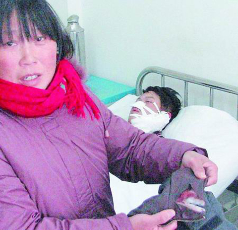 “現在他還不能說話。”管某的同學指了指病床上搭的灰色棉襖說,“事發時,穿的就是那件。”記者看到,這件灰色棉襖襖領左側被砍破,內側的鴨絨露了出來。破裂的襖領處,已被鮮血凝固。