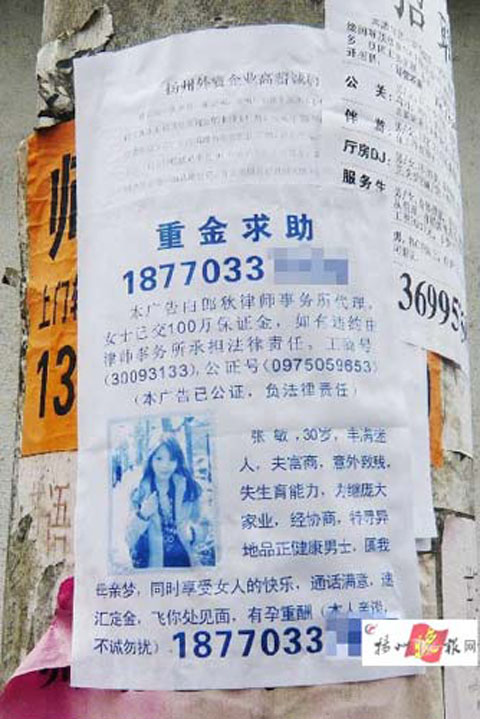 揚州出現多張離奇廣告 美女懸百萬尋男受孕(圖)
