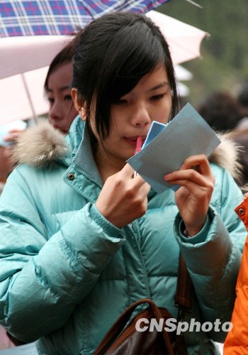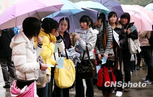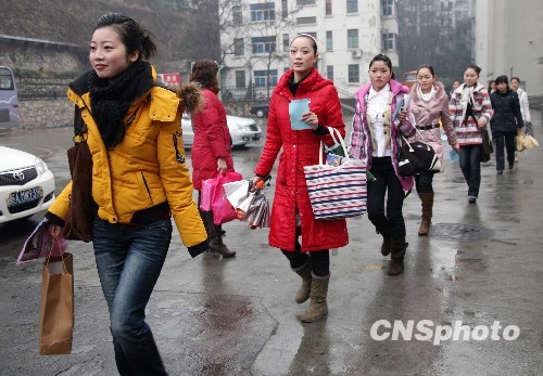 中新網消息 2010年1月30日,在江蘇教育學院的中國民航大學招考點,考生在排隊進入面試考場。當日,中國民航大學空中乘務專業在南京市舉行2010年空中乘務專業招生考試,吸引眾多女生前來應試。據了解,近一段時間,一些考生在江蘇教育學院已經參加了多場國內高校模特、表演、空乘等專業的招生應試,為實現自己的美麗夢想努力和打拼。