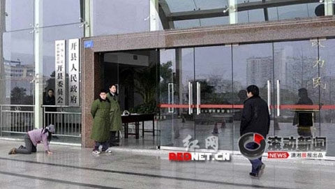 帖子附帶的照片顯示,在掛著“開縣人民政府”的一棟大樓前,有兩個穿著綠色軍大衣的工作人員,雙手背在身后,一名村婦模樣的人雙腿跪地,兩手觸地,另外一張照片則是村婦模樣的人在門口,一個穿綠色軍大衣的人的腳放在農(nóng)婦的身旁,雙手極其淡定地放到背后,隔著一樓大廳的玻璃,依稀看到“執(zhí)政為民”的標語。