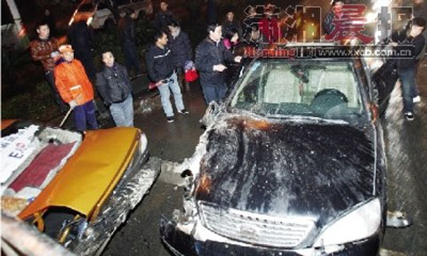 湘AT9607的司機楊先生說,事發時,他剛接到兩名乘客,起步不久,車尾就被撞了,劇烈的撞擊使車子往前沖,撞上了宋先生的車,緊接著又撞上了路邊的花壇。