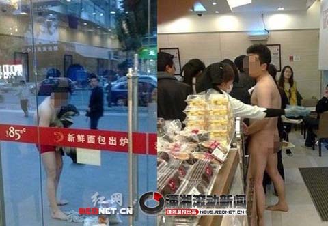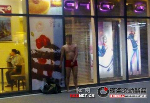 后來,這名男人突然把唯一的紅內褲都脫了下來!然后走進到店里,排在結賬的隊伍中。店員妹妹過來勸說,這樣會影響做生意,希望他能出去。然而這名男子問店員妹妹:“難道你沒有裸過嗎?”店員妹妹回擊說:“我裸過,是在家里洗澡的時候裸,不會在大街上裸……