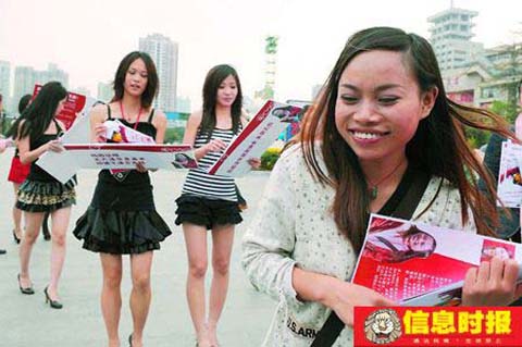 鳳姐前一天高調宣稱整容后,自己非歐美“海龜”不嫁。昨天現身廣州大學商業中心、中山大學南校區,又把目標瞄向廣州高校學生。在廣州大學商業中心,雖然有七八個美女在現場發傳單造勢,可惜也并未引起太大反應。冷場一段時間后,一名戴眼鏡的斯文男生上場獻花,并和鳳姐大膽擁抱,不過,周圍的大學生都指其“很明顯是‘托’啦!”好不容易有一名外籍帥哥上前和鳳姐攀談,不過他不是來應征的,而只是好奇地問鳳姐“為什么敢這么做”,可惜鳳姐英文不怎樣,只能“雞”同“鴨”講。因為現場保安人員的驅趕,鳳姐在大學城只呆了短短的十幾分鐘便匆匆趕往下一征婚現場。