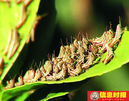 信息時報東莞訊 一片兩指寬的樹葉上竟然趴著五六十只蝗蟲。近日,東莞清溪鎮(zhèn)羅馬村位于新長山附近的一片荔枝林里出現(xiàn)了大量蝗蟲,蝗蟲密集處每立方米達到上萬只。