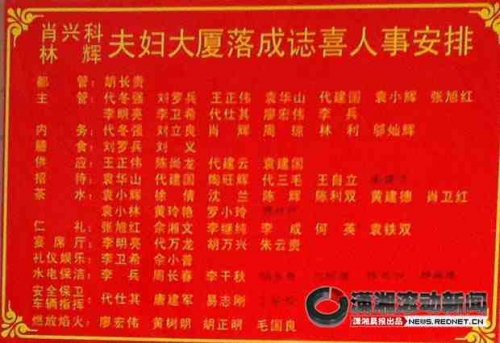 新房墻壁上貼了兩張告示,一張是慶典活動安排表,上面寫著慶典從4月28日下午4時18分開始,男女合唱、歌舞、花鼓戲輪番上陣,28日傍晚7時28分,晚宴開始。29日上午9時38分,10個節目接連上演……而另一張告示則寫著慶典活動“組委會”,比慶典安排表大得多,上面密密麻麻寫滿了人名,包括“水電保潔”、“茶水”、“燃放焰火”等名單,記者數了數,共有69人。