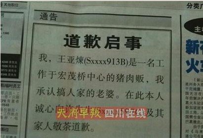 豬肉販因“搞別人老婆”登報道歉 網友熱議(圖)