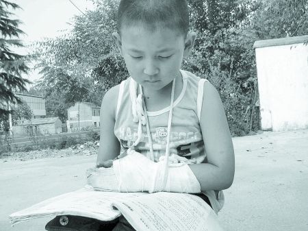 環(huán)球時報消息 21日下午,記者接到小亮的姑姑王艷云的電話反映后,驅(qū)車來到驛城區(qū)水屯鎮(zhèn)集市上王艷云家,見8歲的小亮左手纏著繃帶,正在家里自學(xué)(如圖)。