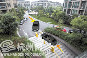 紫金庭園小區(qū)內(nèi),除了主干道可以容許兩輛車相向而過之外,許多小道只能過一輛車。晚上8點多,地面停車位差不多都停滿了。本來,地下車庫的出入口是可以同時一輛進、一輛出的。但是旁邊的地面停車位有輛車子停得稍微出來了一點。這個車庫入口旁邊正好是梅林苑5幢,3樓一位大媽看到——