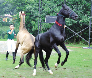 三匹汗血寶馬都是公馬,并且有著好聽的“洋名字”——年齡最大的11歲(黑色),名叫格拉克;年齡稍小的4歲(金色左后白蹄),名叫奧查克;最小的只有2歲(金色兩后白蹄),名叫阿帕奇。在草坪上散步時,1.6米肩高的格拉克明顯是“老大”,每當遇到兩個小弟時,都要高高地躍起前蹄顯示自己的威力。不過,它并不是觀眾們的最愛。據馴馬師介紹,金色是汗血寶馬獨有的顏色,這種馬體形健美、速度快、耐力好,在古代經常被用作軍馬。到了近代,汗血寶馬數量急劇減少,但它們仍保持著84天跑完4300公里的馬中速度與耐力紀錄。現在,這種身價昂貴的寶馬更多的用途是觀賞,經過訓練,它們不僅能做馬躍、跪地等簡單動作,甚至還能跳出優雅的“芭蕾”,入園游客均可免費觀賞。
