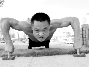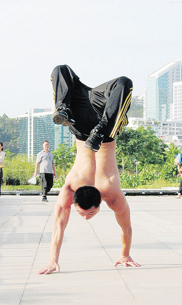 廈門商報訊 他有四大絕招:雙手倒立行走60米,只用不到30秒;雙手倒立快速上樓梯;雙手倒立邊做俯臥撐邊用嘴銜道具;單指做俯臥撐,一口氣就是十幾個。這是他十幾年如一日練就的本領。因為他有一個夢想:想做一個武打明星。