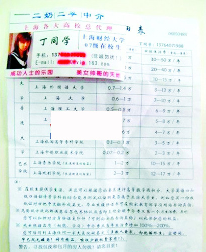 7月20日,網友“pork23”在網上發了一篇名為《上海女大學生包養價格表曝光,憑你實力能包哪種?》的帖子,其中有一個詳細的包養價格表,上面是上海各大高校女生被包養的費用。