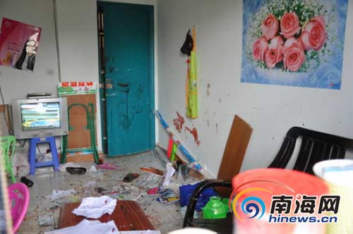 據海口市綠島花苑小區部住戶介紹,9月2日凌晨3時許,一男子手持刀具和木棒進入小區,隨后到了小區的某房間內。過了一會,就聽到陣陣呼救聲,被驚醒的小區住戶出門查看,只見小區某房間外,兩男一女正在扭打,持刀男子把另一男子砍傷,又用手中的木棒把女子打傷。被打女子報警后,轄區文莊派出所民警趕到現場制止,將這3人帶走。記者在事發房間內看到,房間一片凌亂,地上、墻上均殘留血跡。