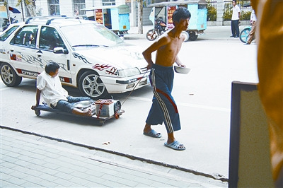 記者趕到漢南時(shí)已是下午2點(diǎn)前后,經(jīng)由市民們指點(diǎn),記者找到了這幫特殊的乞討者,他們兩兩一組,大約有四五組人,每組都有一人坐在平板車上扮演殘疾人,另一人拉著車手拿小盆,向沿街的商鋪挨家挨戶乞討。