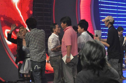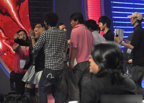 節(jié)目組的導演與工作人員全部沖上臺,阻止陳靜勸其退場未果,隨后保安與工作人員只能強行將陳靜拉出場。突然,陳靜的丈夫也沖到了臺上,穿著白色加點小碎花襯衫的陳靜丈夫來勢洶洶,對著導演破口大罵,幾名工作人員都拉不下他,之后一名工作人員抓起已經(jīng)與導演扭打在一起的陳靜丈夫拽出場外。