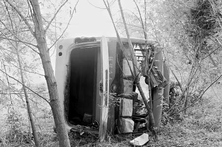 記者趕到現場時,傷員已被送往醫院進行救治,出事的客車躺在溝底,壩面上散落著不少乘客的食物、鞋子以及車輛的前窗玻璃、電瓶等零部件。道路旁的5個隔離樁被撞斷,從壩面草皮被破壞的痕跡判斷,客車先是沿坡面斜著行駛了約十幾米后翻滾著墜入溝底。