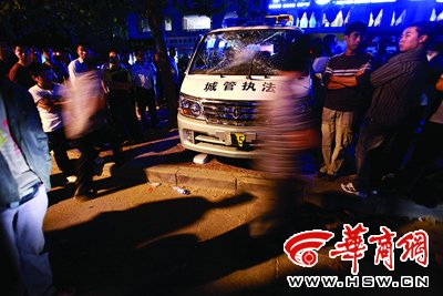 西安商戶與城管沖突 數(shù)百民眾掀翻城管車輛(圖)