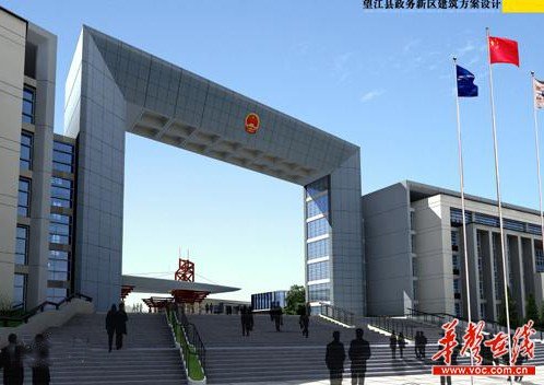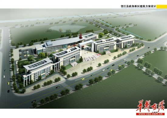 另外,從望江縣政務新區的規劃設計圖可以看到,整個樓體均由玻璃鑲嵌而成,猶如一塊巨大的銀幕,在玻璃幕墻裝飾的拱樓中間,紅色的國徽十分醒目。