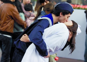 活動(dòng)開(kāi)始后,分四個(gè)區(qū)域排好隊(duì)的情侶們開(kāi)始接吻。一名男子穿著藍(lán)色水兵服,女孩身穿護(hù)士服,“水兵”輕攬“護(hù)士”腰際,“護(hù)士”閉目上身傾倒,原來(lái),他們?cè)谀7轮摹笆兰o(jì)之吻”。